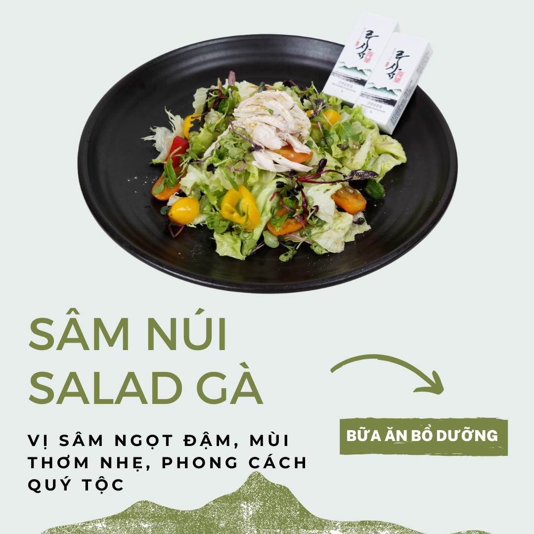 Salad Gà Sâm: Ức gà luộc, xẻ nhỏ. Rắc bột sâm vào gà trộn đều. Trộn gà đã được tẩm sâm với các loại rau và nước sốt theo khẩu vị.